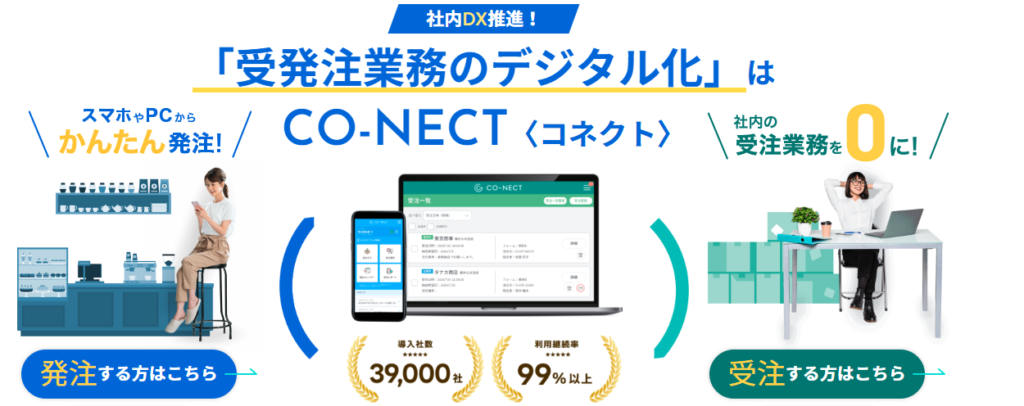 CO-NECT株式会社のBtoB受発注システムCO-NECTは、LINE連携が可能な受発注プラットフォームです。LINEのアプリ内で商品発注と通知の受け取りができるため、新たなアプリ操作習得の負担なく導入できます。
