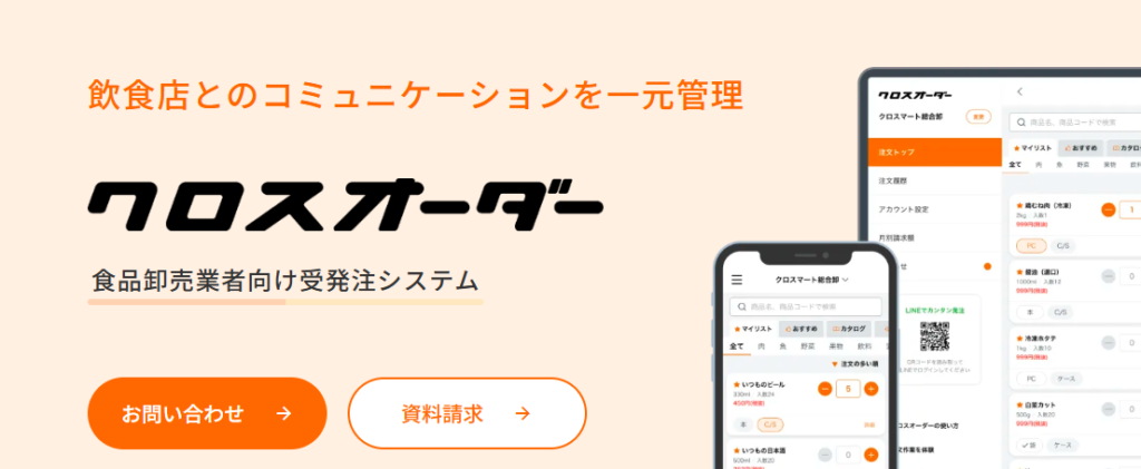 クロスマート株式会社のクロスオーダーは、物流・卸売業界と飲食店間の受発注業務に特化したシステムです。
