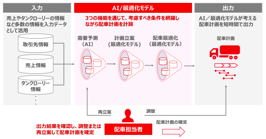 出光興産とアクセンチュアは、70名の配車担当者が手作業で立案していたプランを、AI+最適化モデルによって自動化し、配車計画の作成時間を25%削減しました。