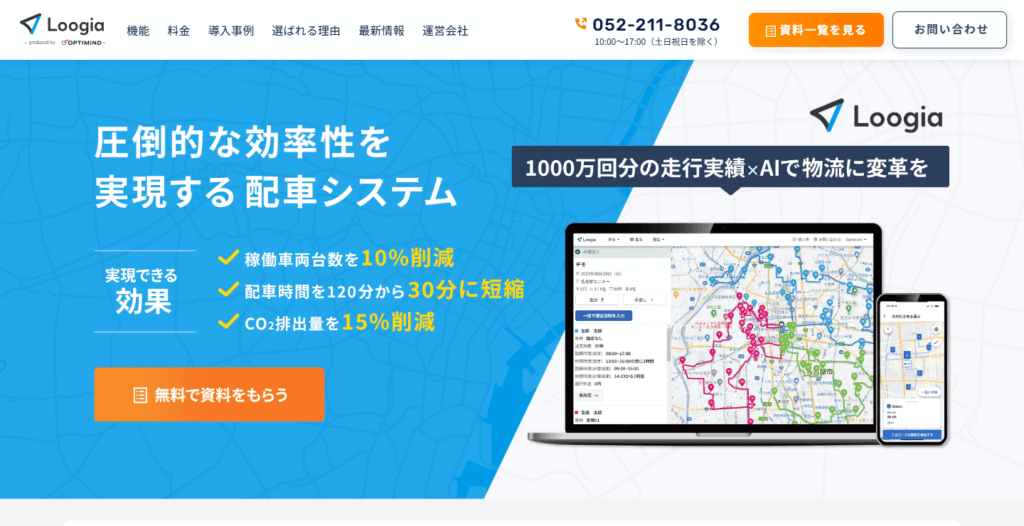 「Loogia」は、AIによる自動配車・ルート最適化・到着予測を実現するクラウド型運行管理システムです。