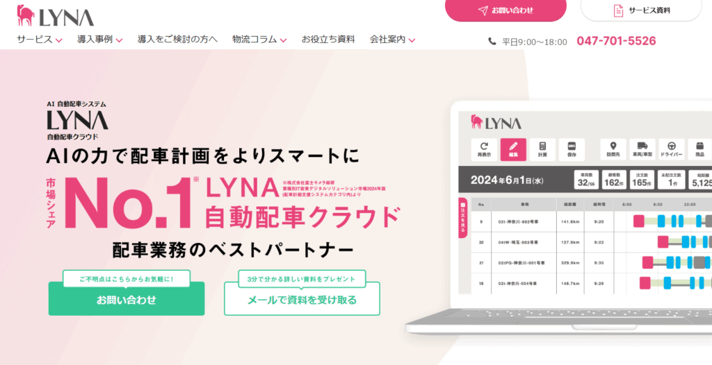 「LYNA」は、AIによる最適化技術を活用し、過去の配送実績・交通状況・車両稼働率などのデータをもとに、最も効率的な配車計画を自動で算出するクラウド型配車システムです。