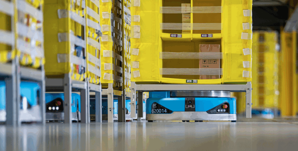 Amazonのフルフィルメントセンターでは、Kiva Systems(現・Amazon Robotics)の棚搬送ロボットを中心に、世界規模でGTP方式の自動化を展開しています。