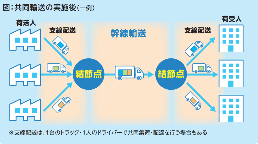 共同配送は、複数企業の荷物を同一ルート・同一車両に集約することで車両稼働の重複を解消し、輸送力不足を補う取り組みです。
