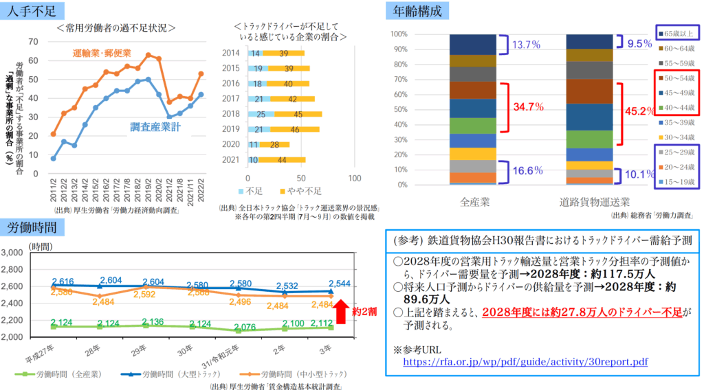これに伴い、ドライバーの稼働時間減少 → 便数減 → 輸送力不足 → 一人当たりの負荷増 → 離職・採用難という悪循環が生じやすい状況です。