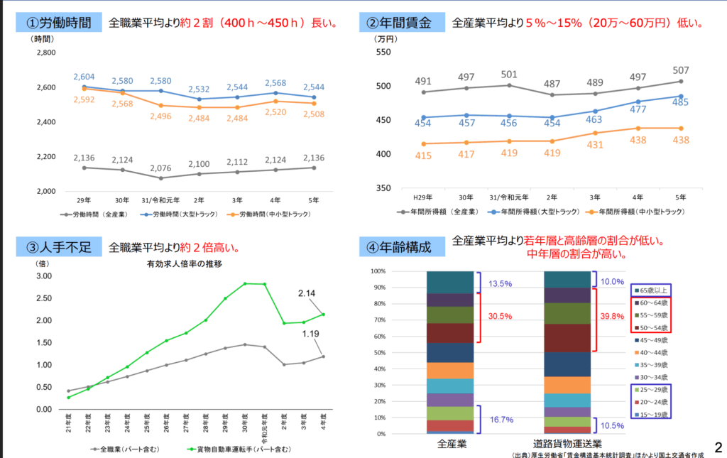 国土交通省の統計によれば、トラック運送業は全産業平均より労働時間が約2割長い一方、年間賃金は5〜15%低く、有効求人倍率は約2倍と、人手不足が深刻化しています。