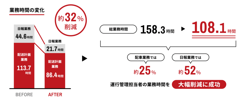 運行管理システム「AIR」の導入事例では、配車・日報・動態・労務をクラウドで一元管理できるようになったことで、運行管理者の業務時間が約32%削減されています。