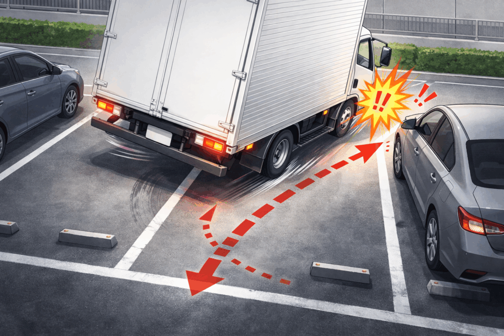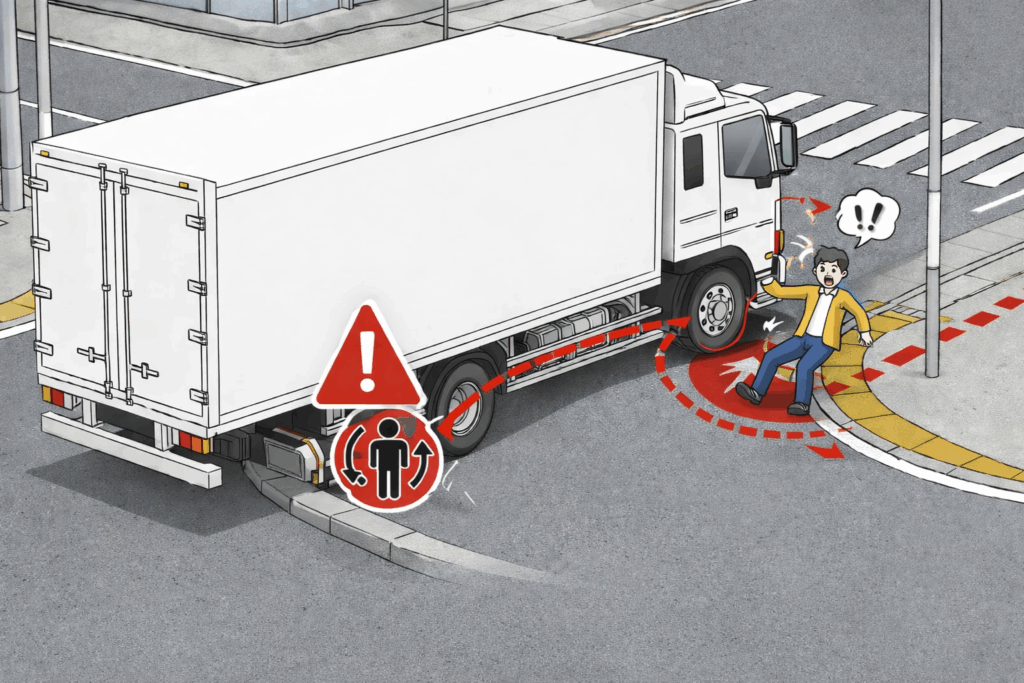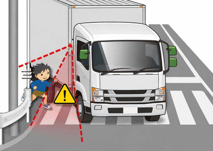 トラックは普通車に比べてピラーが太く、歩行者と車両の動きが一定の角度で重なり続けるコリジョンコース現象が起きやすい構造です。ドライバー自身が体を動かして死角を消しに行く積極的な動作が事故を防ぐ手段となります。
