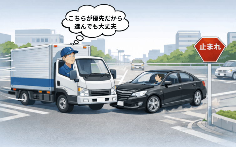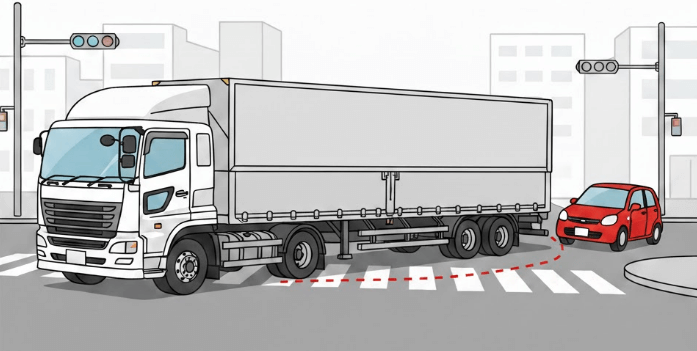 トラックは車体が大きく、相手からは距離感が掴みにくいため、無理な飛び出しを誘発する場合があります。相手がルールを守るという前提を捨て、減速していない車両があれば即座に危険を想定する行動基準組織として定義することが重要です。