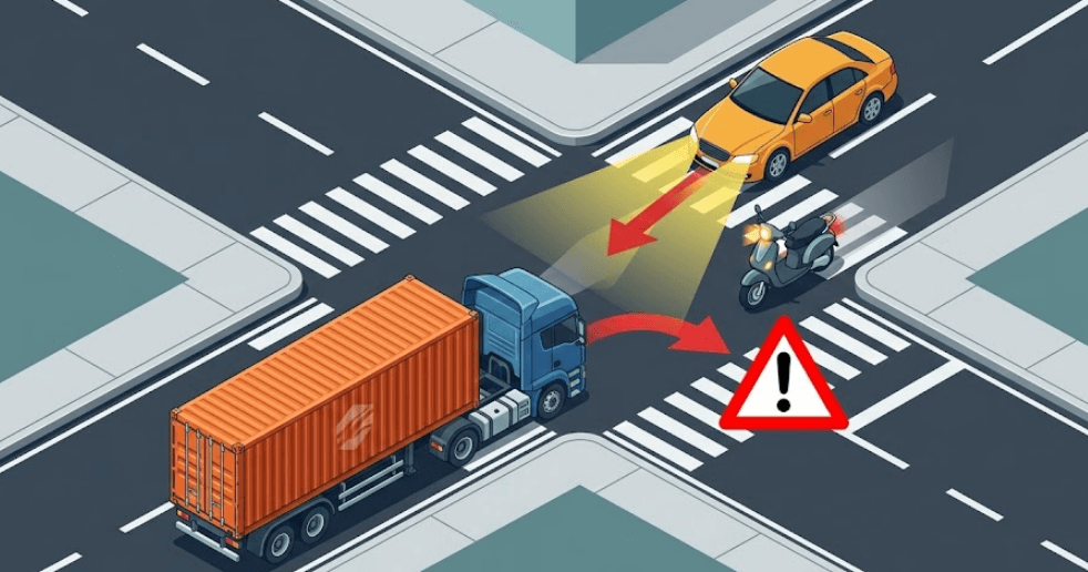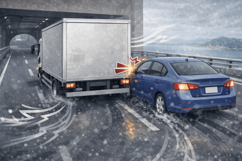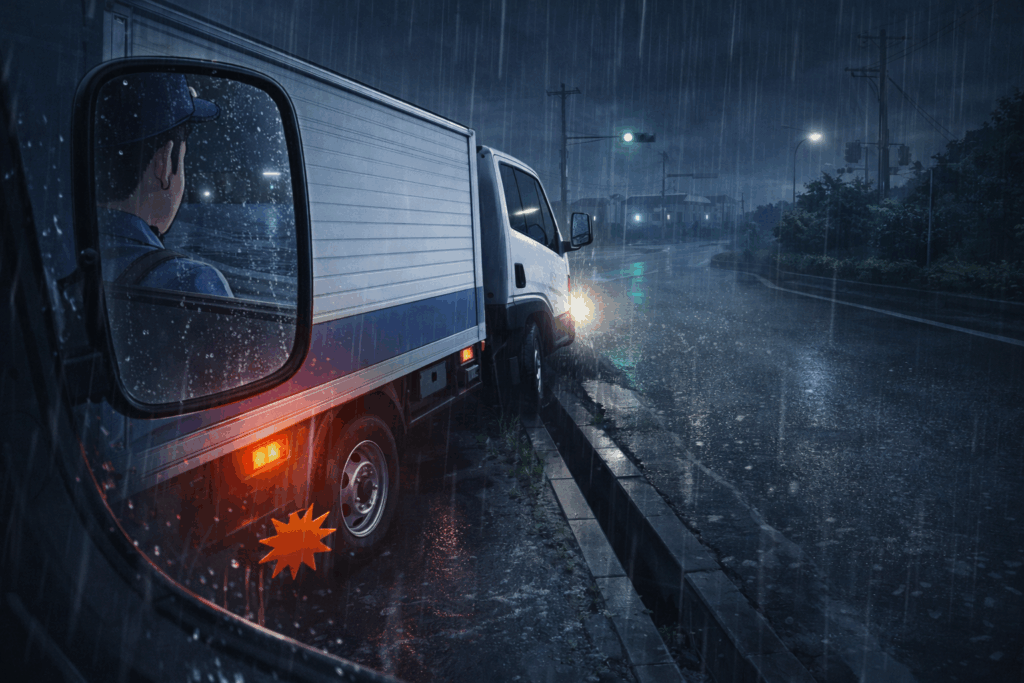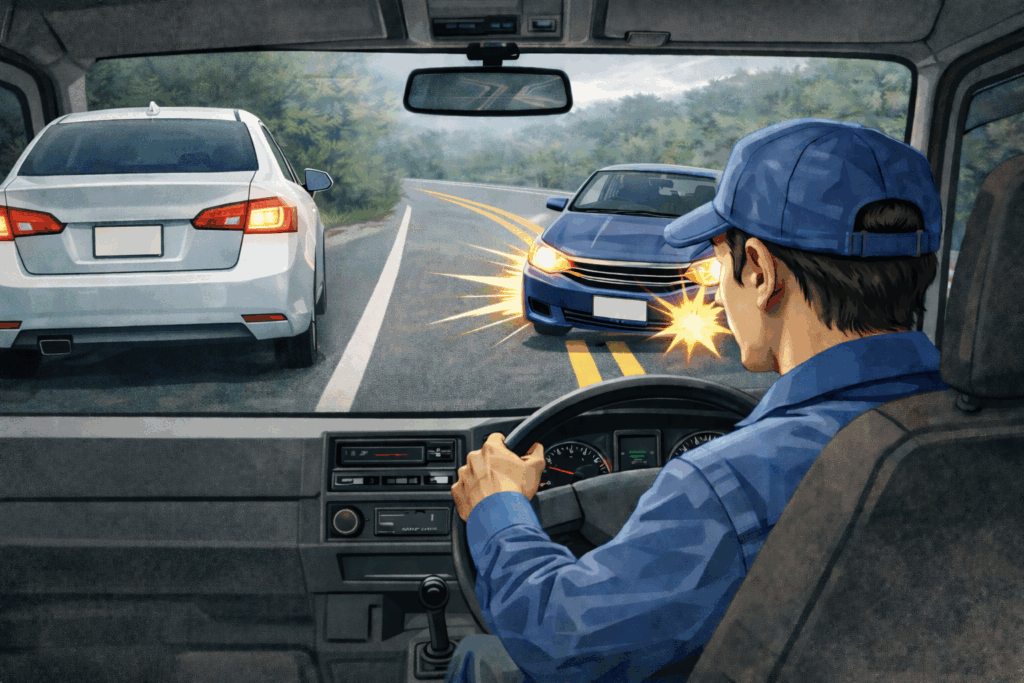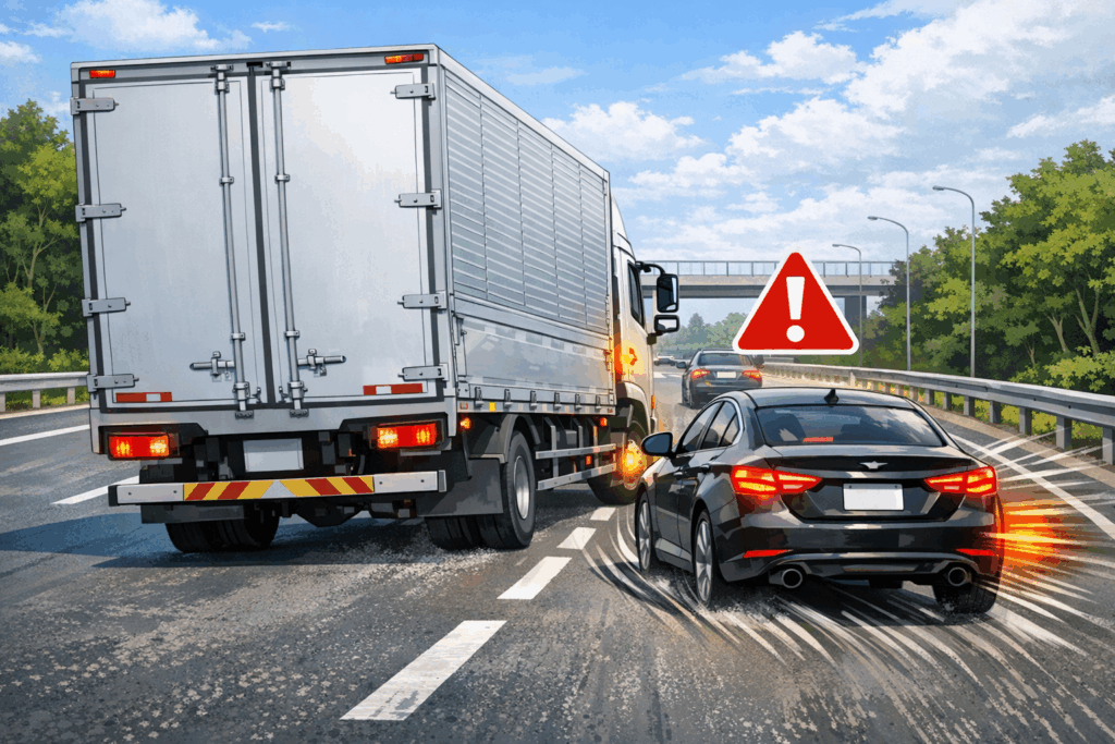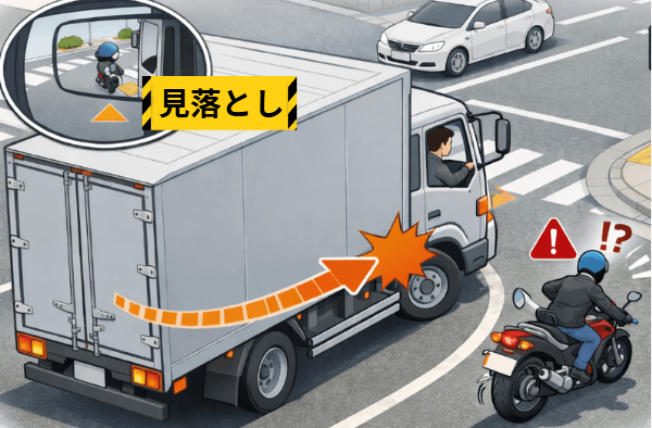 サンキュー事故は相手の厚意が引き金となり、心理的な油断が発生しやすい事故類型です。特にトラックは視点が高く、低い位置を走行するバイクや自転車が死角に入りやすい構造的特性があります。