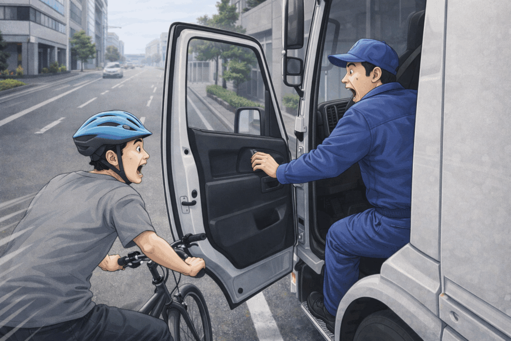 トラックのドアは大きく、開いた際には車幅から大きくはみ出します。路肩停車中は自転車やオートバイが側方を通過する可能性が高く、突然開くドアは重大事故につながります。停車後も周囲は走行環境であるという前提を共有し、完全な後方確認を終えるまでドアを開けない行動基準を組織として構築しましょう。