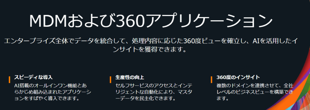 | 対応業務 | ・一元化されたデータガバナンス ・データ品質管理と分析 ・マルチドメイン管理 など |