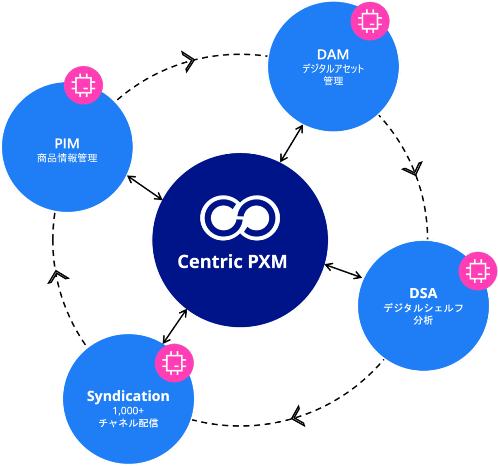 Centric PXMは、商品情報と画像・動画などのデジタル資産を一元管理し、ECやマーケットプレイス、Web、販促ツールといったあらゆるチャネルへ、正確かつ一貫した商品体験として配信します。