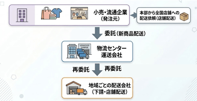 アパレルチェーンの本部が物流センターから全国の店舗へ新商品を配送する業務を運送会社へ委託し、その運送会社が地域ごとの配送会社へ店舗配送を再委託する取引の場合、荷主である小売企業が運送会社へ配送を依頼し、その運送会社が別の運送会社へ実際の配送業務を委託する取引にあたるため、特定運送委託に該当します。