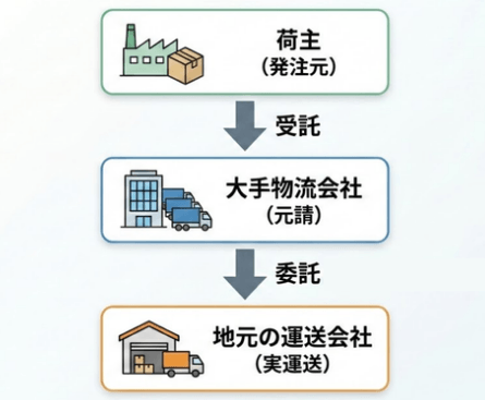 元請け運送会社が、自社で運びきれない荷物を下請け(協力会社)へ再委託するケースは、いわゆる多重下請け構造に該当し、発注者・継続性・委託内容の3条件を満たす場合に特定運送委託に該当します。この取引構造において、元請け運送会社は2つの側面を持ちます。