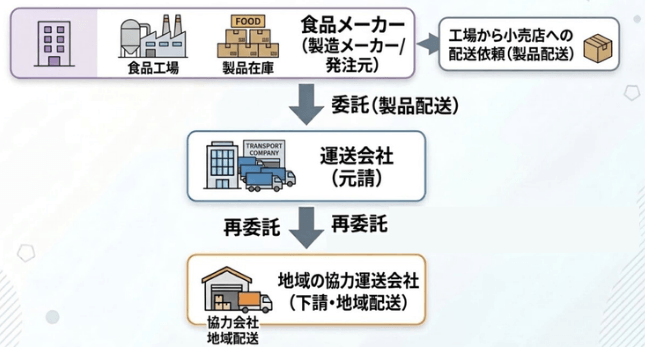 食品メーカーが工場から小売店への商品配送を運送会社へ委託し、その運送会社が地域の協力運送会社へ配送業務を再委託する場合実運送が別会社へ委託される構造にあるため、特定運送委託に該当します。
