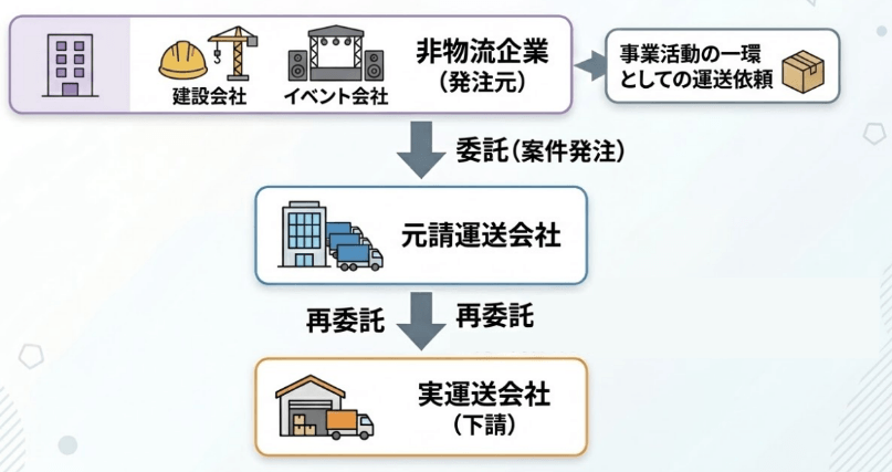 建設会社が資材置場から現場まで鋼材の運搬を運送会社へ依頼する場合や、イベント会社がステージ機材の搬入を専門業者へ委託する場合など、物流を本業としない企業からの依頼でも、事業活動の一環として運送が委託される取引は広く見られます。